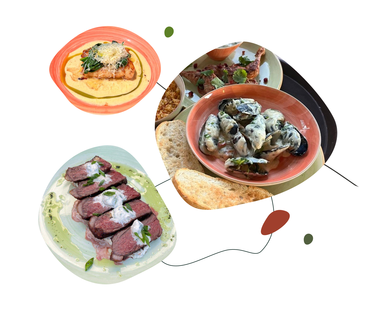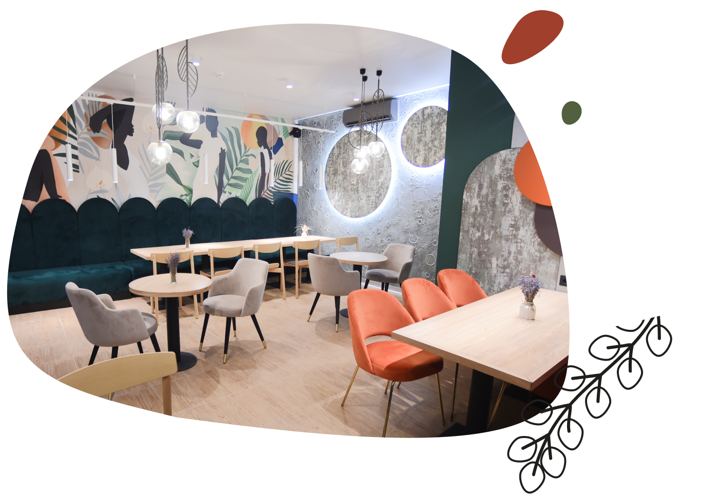 Дизайн ресторана продумывали с любовью к этому месту: уютные диваны и кресла из велюра приятного на ощупь, удобные стулья, стильные светильники в ботаническом стиле. Особые ощущения создает картина на стене: загорелые стройные девушки, как символ солнца, моря, загара и белого песчаного пляжа, которым славится Оленевка в Крыму.